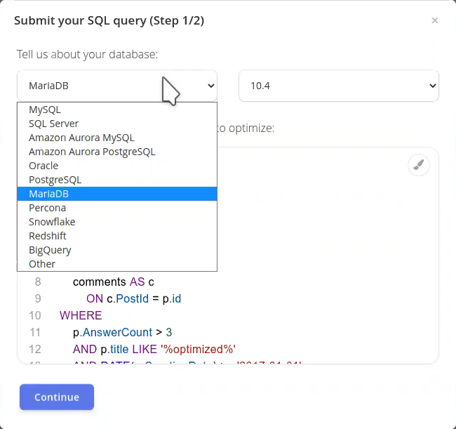 1. Configure the EverSQL SQL Optimization Tool with the Database Server Type and Version